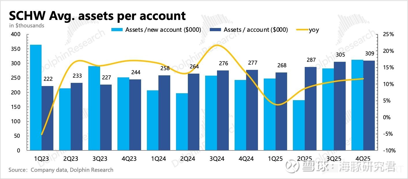 (2)四季度客户资产总规模接近 12 万亿美元,人均账户资产规模进一步增长到 31 万美元。整体来看,当季新增的 3000 多亿资产,只要来自新增入金 1640 亿(另有一次性转出 60 亿),以及本身资产增值 1510 亿。