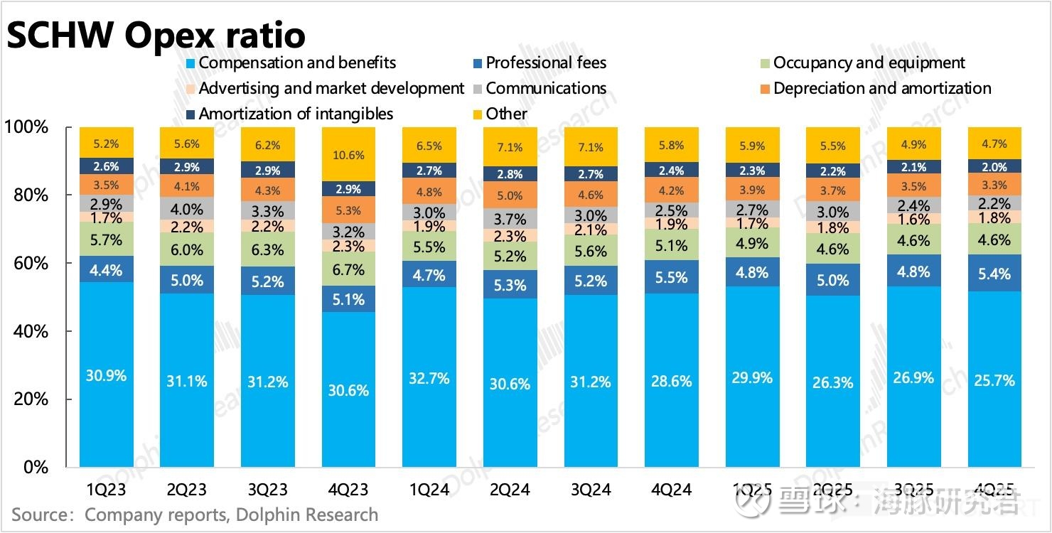 作为成熟的金融平台,支出端一般情况下保持稳定。嘉信目前有产品创新的需求,因此在专家人员费用上还在保持稳定增长趋势。但总体看运营支出,增长依旧低速,只有 4% 远低于收入增速。