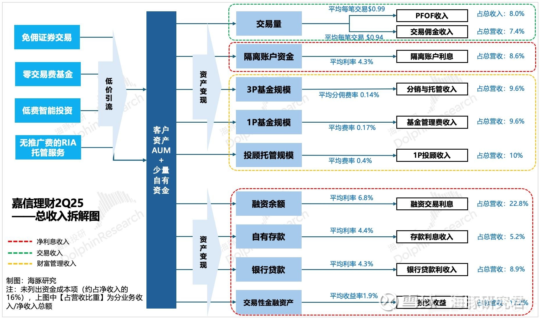 在交易、基金降佣的大趋势下,嘉信依靠存贷息差、投资固收类的金融资产带来的利息收益,弥补了交易收入的缺口。从集团整体来看,商业模式逐步定型——通过免佣金的证券交易,低通道费、零交易费的基金申赎,低咨询费的智能投资以及无推广费的独立 RIA 托管服务来引流,壮大整体客户资产规模(AUM)后,最终以资产生息(存、贷款利息/投资收益)为主的创收模式。