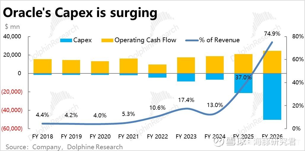 d. 高额 Capex 和负债压力已经不小,且高点还没到:同样和 CoreWeave 的情况类似,大规模新建数据中心给 Oracle 在现金流和负债上带来的压力也是巨大的。