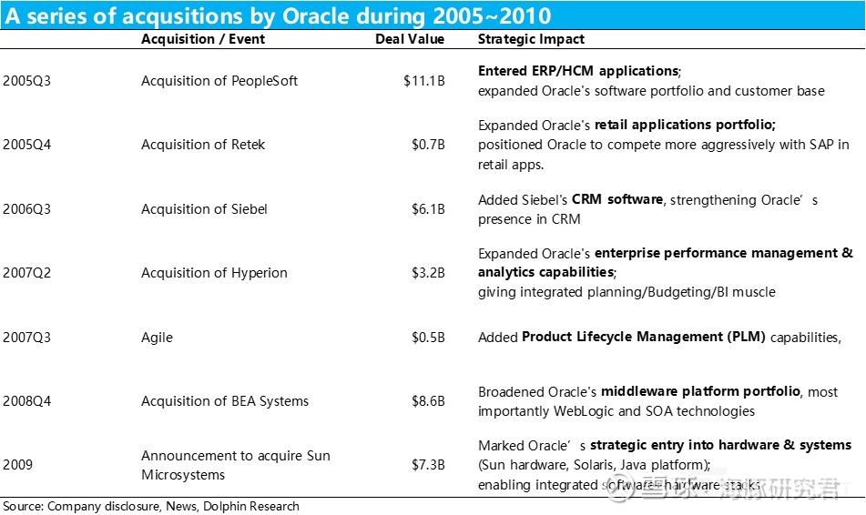 通过这些收购,Oracle 迅速补强了其在企业管理软件上的技术能力和业务规模,成为了当时在该领域内仅次于 SAP 的第二大龙头。