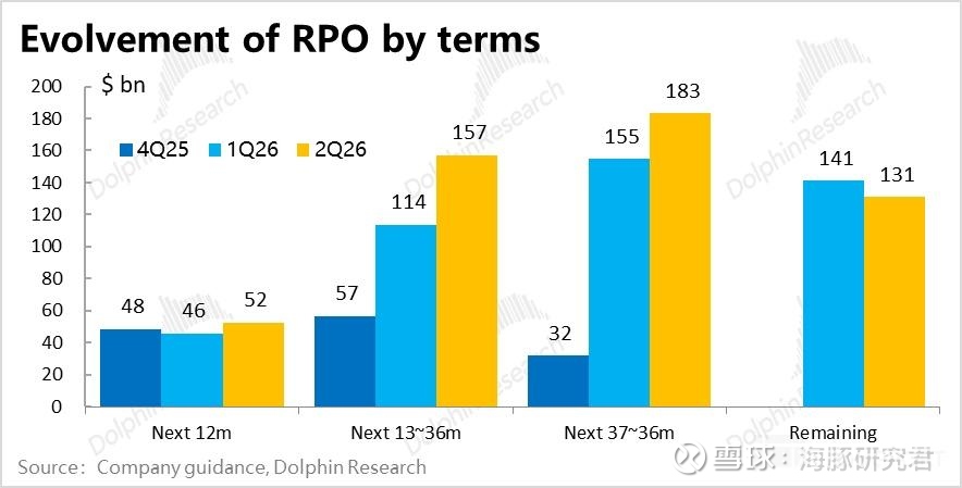 最新RPO(合同履约余额)会在后续不同时间段内确认的金额(分未来 12 个月,未来 13~24 个月等 4 段区间),大致匹配 FY26 财年,FY27~28 两年,FY29~30 两年的收入指引,可以看到: