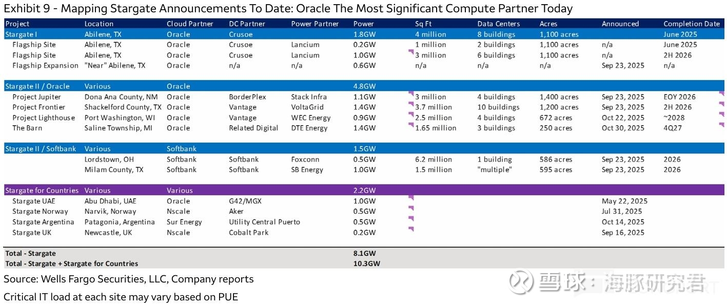 结合 7 月 22 日 OpenAI 宣布和 Oracle 在 Stargate 框架下,新增了第二批规模约 4.5GW 的算力供应协议,即下表中的 Stargate II 中的 4 个项目,市场因此认为这个每年$300 亿的订单就对应着 Stargate II 项目,并按 5 年的合同期,预期在 F1Q26 时 RPO 会环比新增$1500 亿上下。
