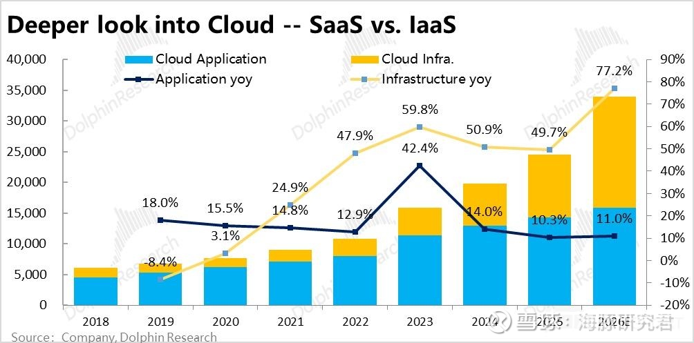 从复盘可以看到,Oracle 原先的传统核心业务 -- 软件已持续衰退多年,云板块中的 SaaS 类业务增长也不算强,近乎完全依赖于 IaaS 这一项业务带动增长。