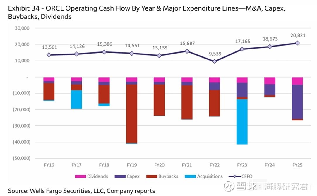 近十多年来 Oracle 一直采取 “举债经营” 的理念。由下图可见,16 财年以来公司的现金支出就几乎每年都高于经营现金流,早年间主要用于巨量的回购和对外收购,未来则将主要用在 Capex 上。