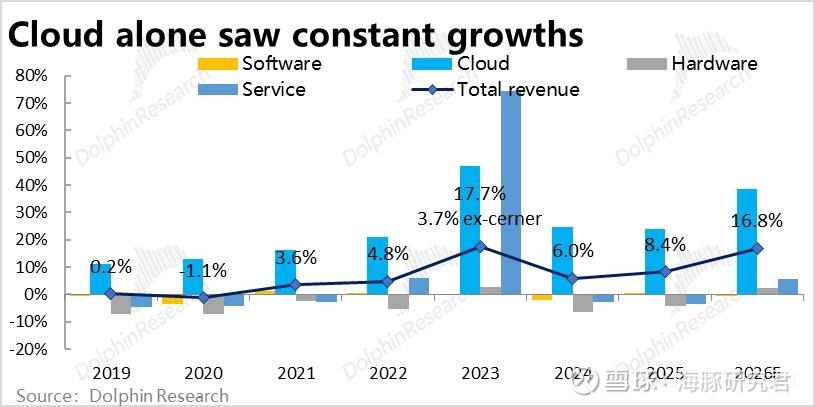 主要的改变是,原先云业务和软件业务是在同一大板块内一同披露,相互有所交叉。本次把云板块单纯拆出来 -- 更清晰的分为云业务(Cloud),软件(Software),硬件(Hardware)和服务(Service)四大板块,以便市场能更清晰的跟踪其云业务的发展。