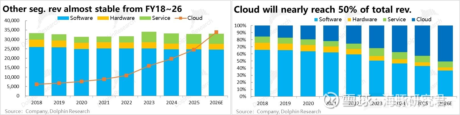b. 软件:即由客户自行部署和管理的传统软件业务,公司原本收入占比最大的板块,但已被云板块反超(占比从 6 成以上下降到不足 4 成)。