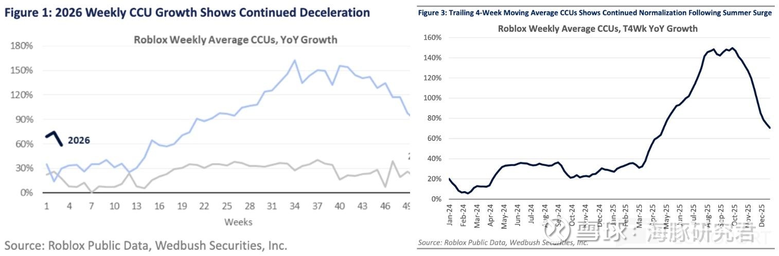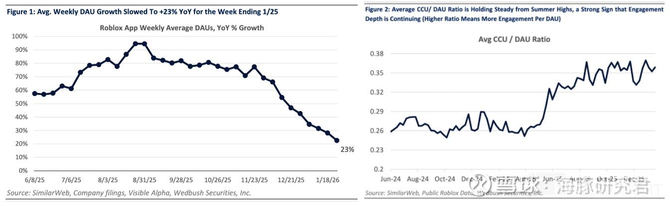 Roblox 作为一个成长股,虽然市场愿意相信变现力会在未来得到全面释放,但短期上,市场仍然会去交易用户参与度的高频波动——平台每日同时在线人数的变化。