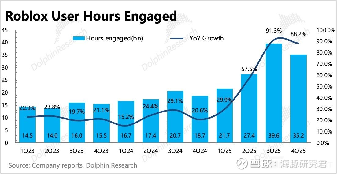 虽然爆款来的快去的也快(中小开发商的长期运营经验不足),但海豚君看到的是 Roblox 这个平台的粘性在提升——同时在线人数(CCU)占 DAU 比重一直在提高,哪怕在爆款降温的四季度,也同样的增加,这表明忠实用户似乎并未因为爆款热度下降或返校季而离开 Roblox。