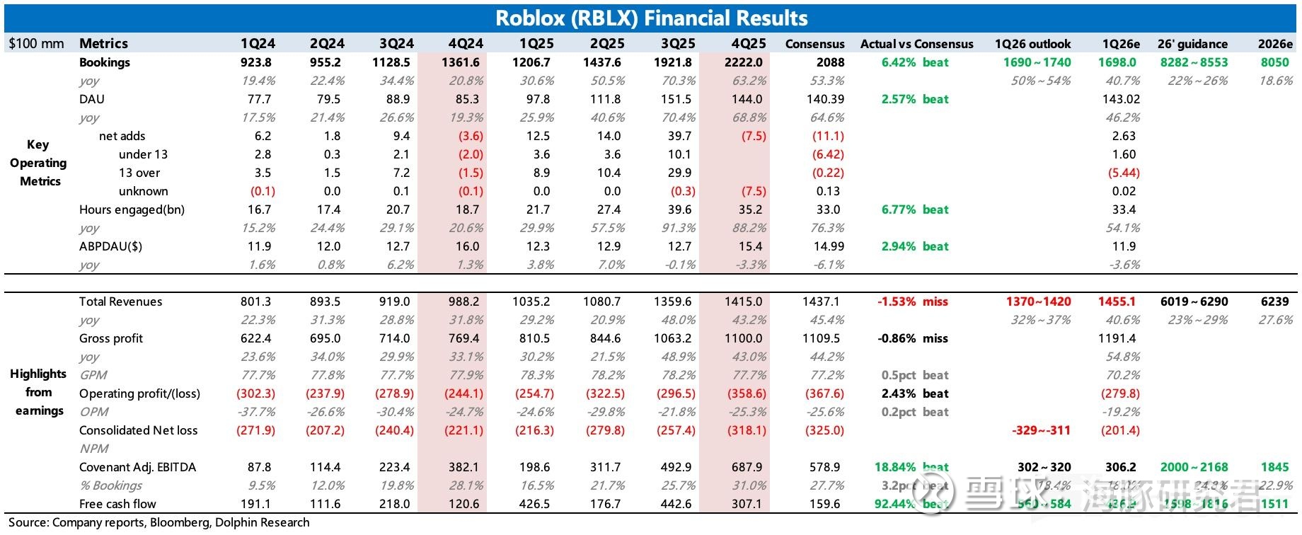 最终计算得 Covenant Adj. EBITDA 四季度为 6.9 亿,占 Bookings 比例为 31%,达历史新高。不过由于前文所说的提高开发者分成、基建费用、信任与安全费用等支出,公司指引 2026 年该利润为 20~21.7 亿,利润率相比 2025 年要下降不到 1pct。