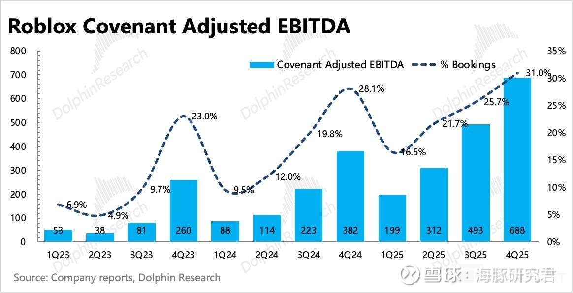 最终如果按照流水资金进出的思路,来调整出 Roblox 真实的赚钱能力,也就是用 Covenant Adj. EBITDA 来跟踪——相当于进来的 Bookings,抵扣掉基本运营所需要的现金支出后,剩余留存的现金。