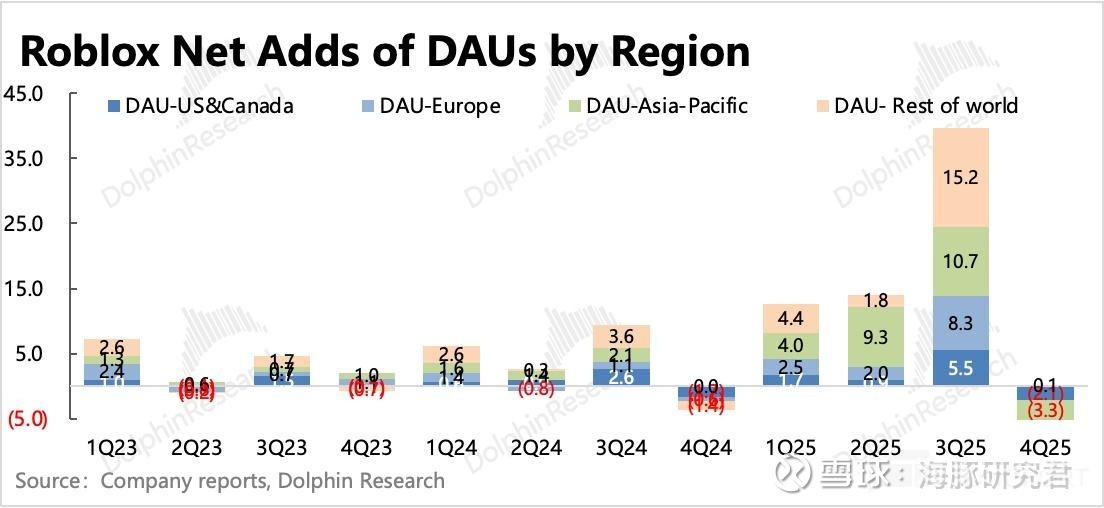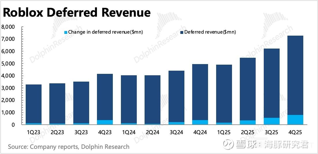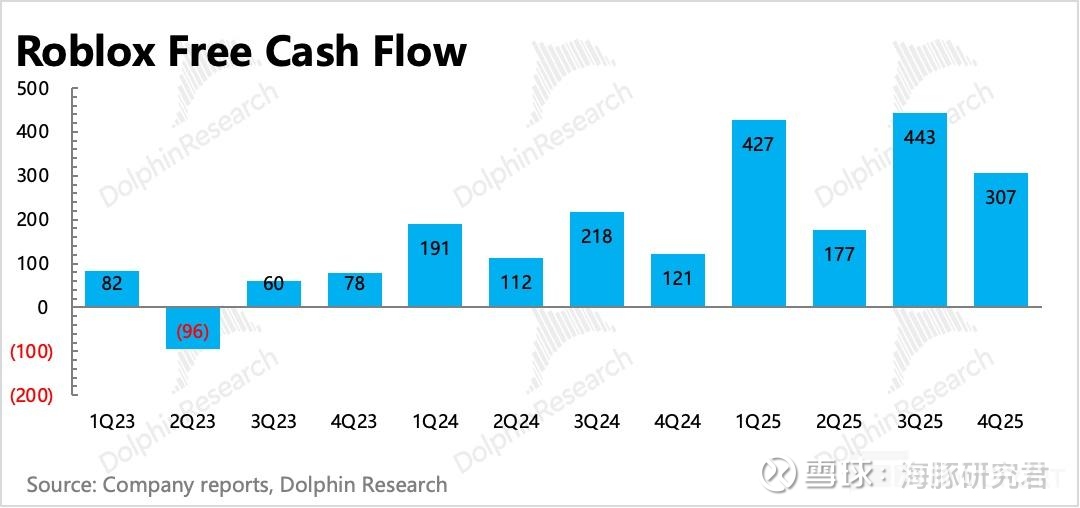 否则就会因为递延周期太长(非一次性消耗的虚拟商品,一般按照用户平均生命周期 27 个月来进行递延确认)、收支周期错配(收入递延,但是付给开发者的分成费用不递延)而产生差异,而低估了其商业模式下的现金流优势——截至 2025 年末,年收入不足 70 亿、看似长年巨亏的 Roblox,已经积累了近 45 亿的净现金。