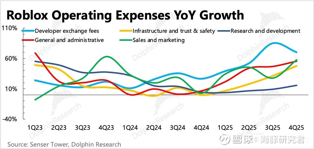 主要提高的还是开发者分成,占到了总运营支出的 27%,也占到了总收入的 34%;其次是基础设施和信任安全方面投入,为了支撑 1.44 亿用户每天 2 个多小时的顺畅体验,需要同步扩容服务器,保证运行稳定。