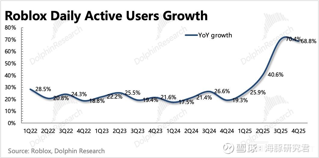 对 Roblox 来说,流水比收入更具备前瞻性,因此也就更值得关注,这次 Q4 以及对今年 Q1 的指引均超预期。此前市场担心今年的高基数压力,预期流水增速要低于一直以来的中长期指引 20%。
