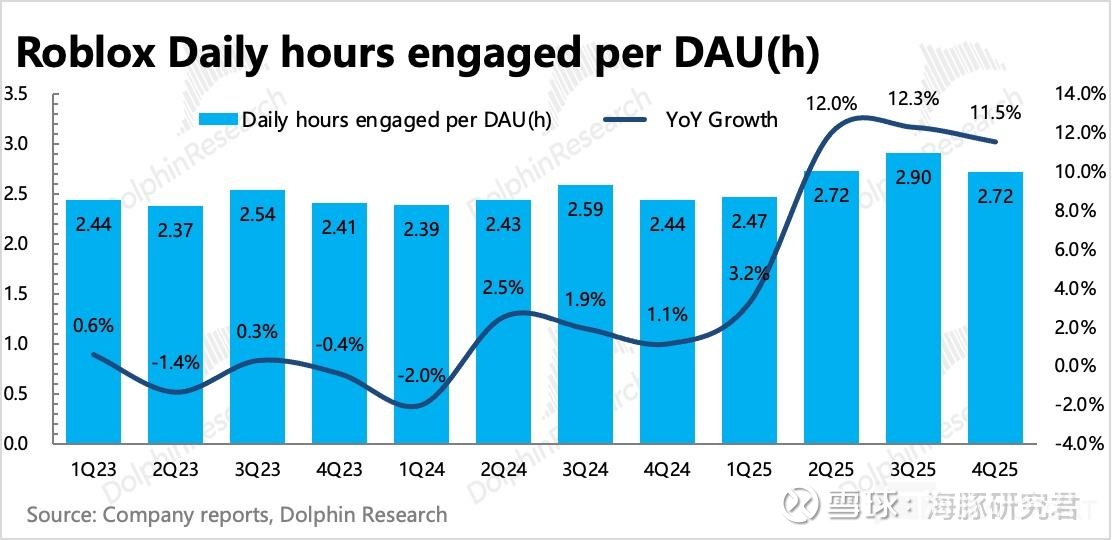 实际上看,情况没有那么糟。Q4 日活增长 69%,总时长提高 88%,计算得人均时长也有 11% 的同比增加。从环比上看,下滑幅度(11%)虽然确实比往年略高(3%~9%),但 25 年的 Q3 尤其是暑假是快速拉高的历史巅峰,再加上 Q4 本身是返校季,因此这个降温趋势还好。