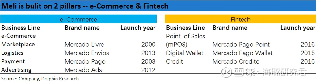 MercadoLibre作为拉美地区最大的互联网公司之一,旗下拥有电商和金融支付两大板块。以下我们按公司在财报中的披露口径,梳理下公司的主要业务构成,以便更好地理解公司的概况和下文的分析: