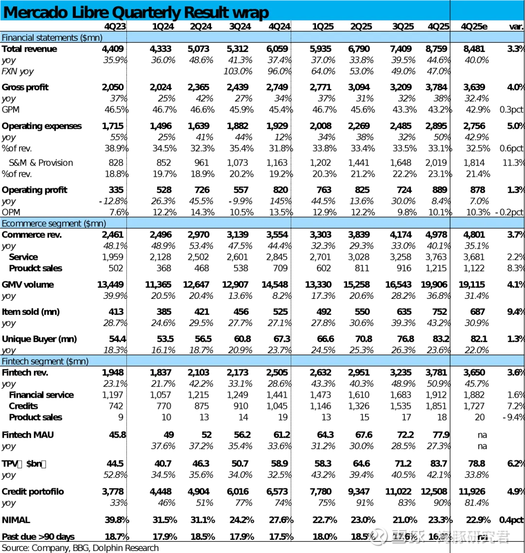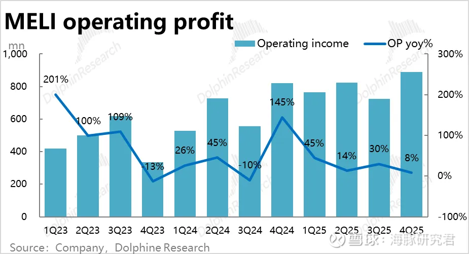 由于电商业务和信贷业务都增长不俗,本季Meli整体营收同比增长了近45%到87.6亿,环比有不小提速,且高于彭博一致预期约3pct。增长端的表现可以说不错。