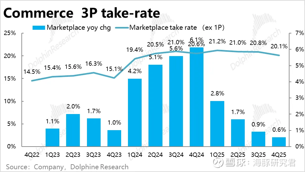而3P平台收入(则同比增长约32%,测算出的电商3P平台变现率为20.1%,同比提升幅度走低至仅0.6pct,再创新低,体现了降低免邮门槛等举措,通过将利润空间让渡给商家或消费者以促进增长,抢夺市占率的态度。