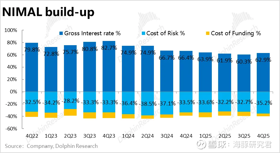 对应的,本季的贷款净息差NIMAL也从上季的21%改善到23.3%,除了上面提及的毛利率走高外,本季的资金成本也环比下降了超2pct,但部分被更高的坏账准备计提所对冲了。