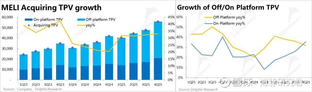 进一步拆分,收单性支付中的平台外支付额同比增长32%,有所放缓。同时平台内支付额增速则明显提速到36%。平台内支付增长少见的反超平台外,主要是因自身电商业务本季增长的大幅提速。