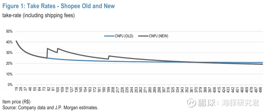 主要变化是,市占率第二的Shopee近期在巴西市场连续调高了变现率,包括:a. 对个人卖家收取的每单服务费从R$5上调到R$7(40%的调升); b. 对企业卖家的佣金曲线也做出调整,由下图可见主要变化是拉升了R$80~ R$300这一价格区间内商品的佣金率。