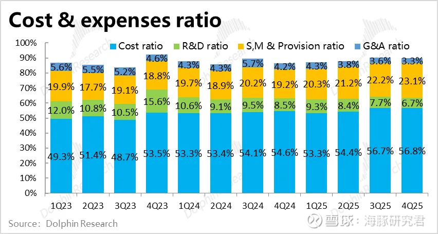 从成本和费用角度,本季的毛利率为43.2%,同比收窄了超2pct。虽然公司不披露各个板块毛利率细节,但结合上文的分析,电商板块的免邮门槛下调、支付业务和信贷业务同比角度的变现率也都在走低。毛利率下滑并不意外。
