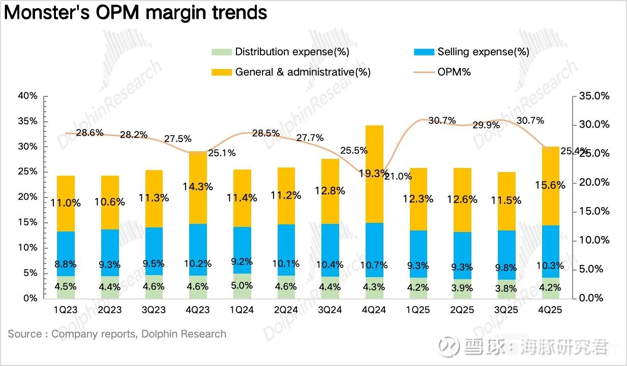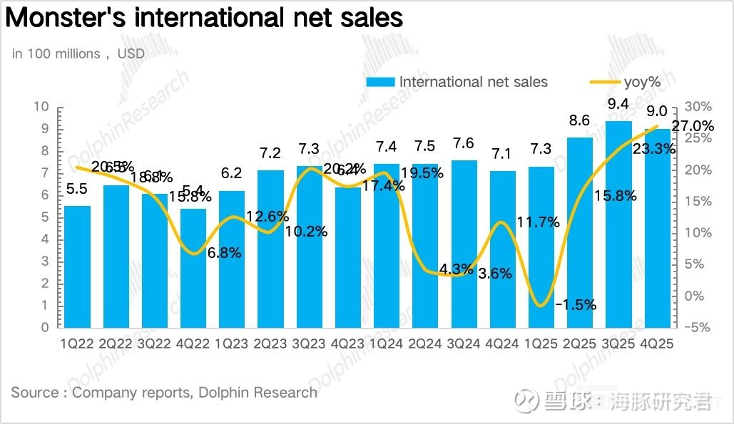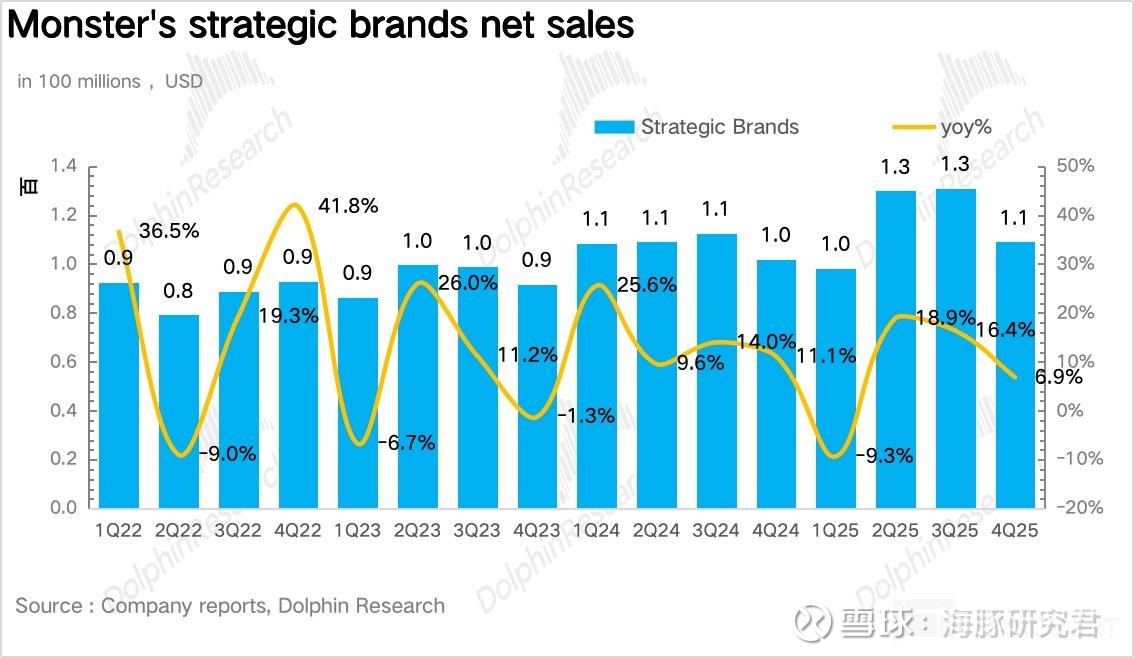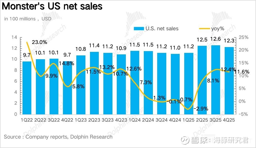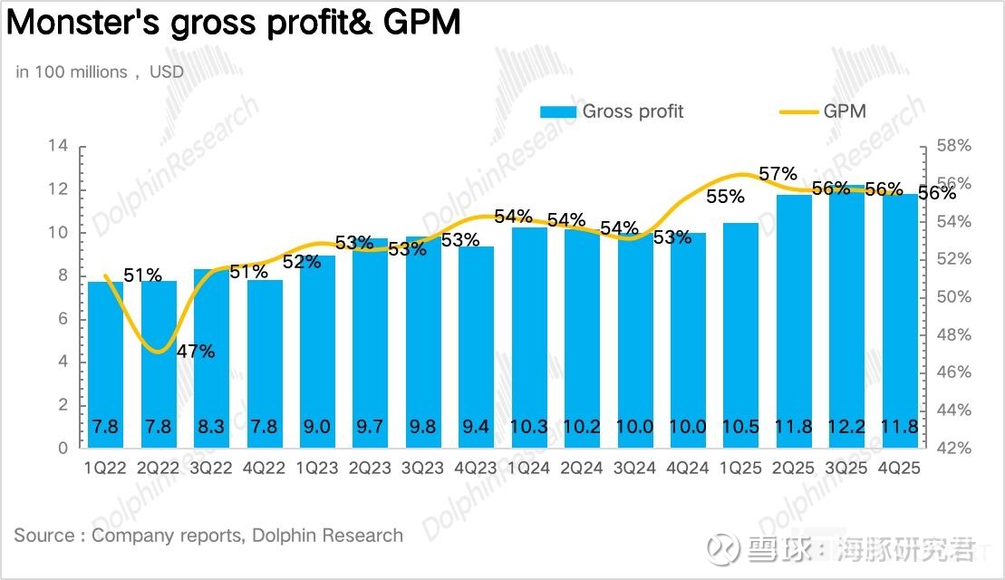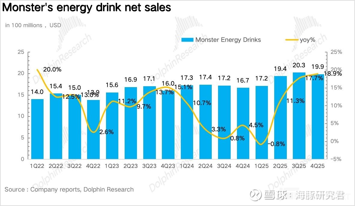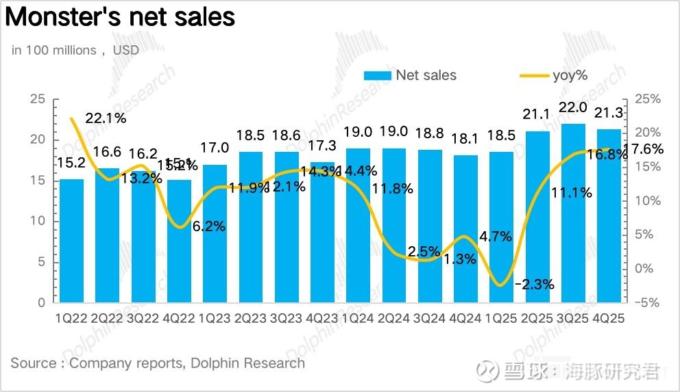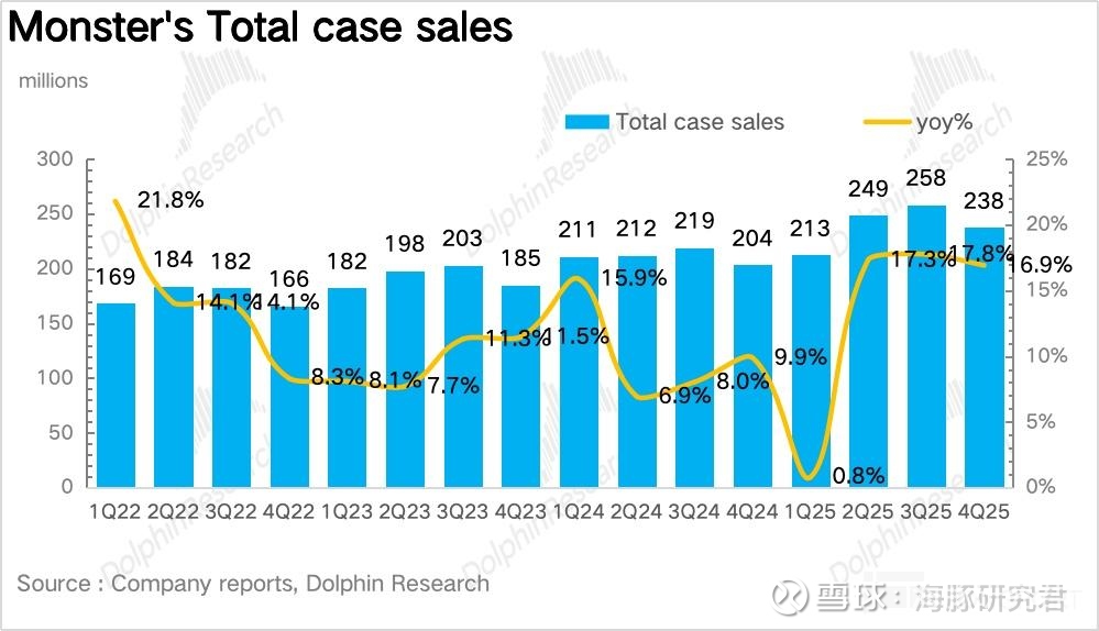 量:量价拆分看,作为 Monster 当前业绩的核心驱动,4Q25Monster 实现销量 2.4 亿箱,同比增长 16.9%,趋势上延续了三季度的高速增长。