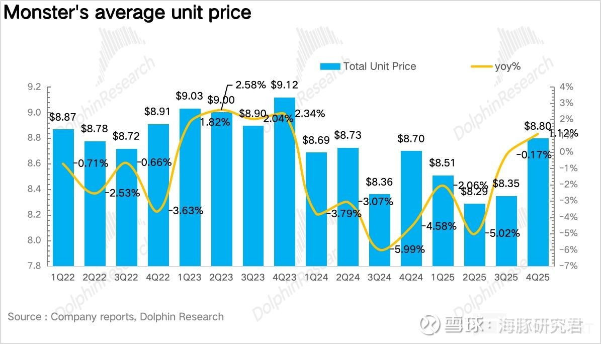 价:4Q25 Monster 平均价格达到 8.8 美元,同比增长 1.1%,重新变为正增长。一方面,面对因关税带来的铝罐成本飙升,11 月开始,Monster 在北美核心市场针对不同规格、不同品类进行了不同幅度的提价(平均提价幅度在 5% 左右)也减少了促销力度,另一方面,零糖、联名款、健康化产品等高溢价品类占比的提升也对冲了国际市场占比提升带来的客单价的下滑。