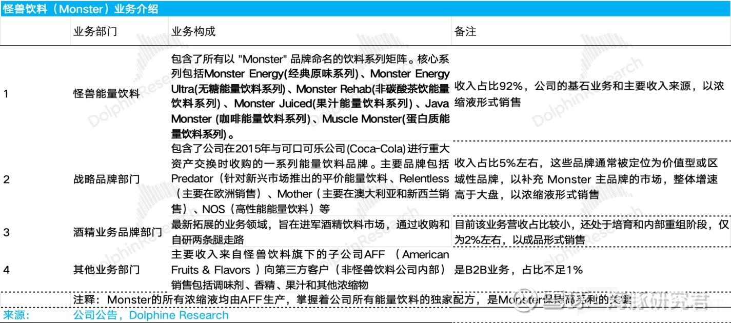 根据 Monster 的官方披露口径,公司营收增长可以拆解为怪兽饮料,战略品牌、酒精业务品牌和其他业务四大部门,其中: