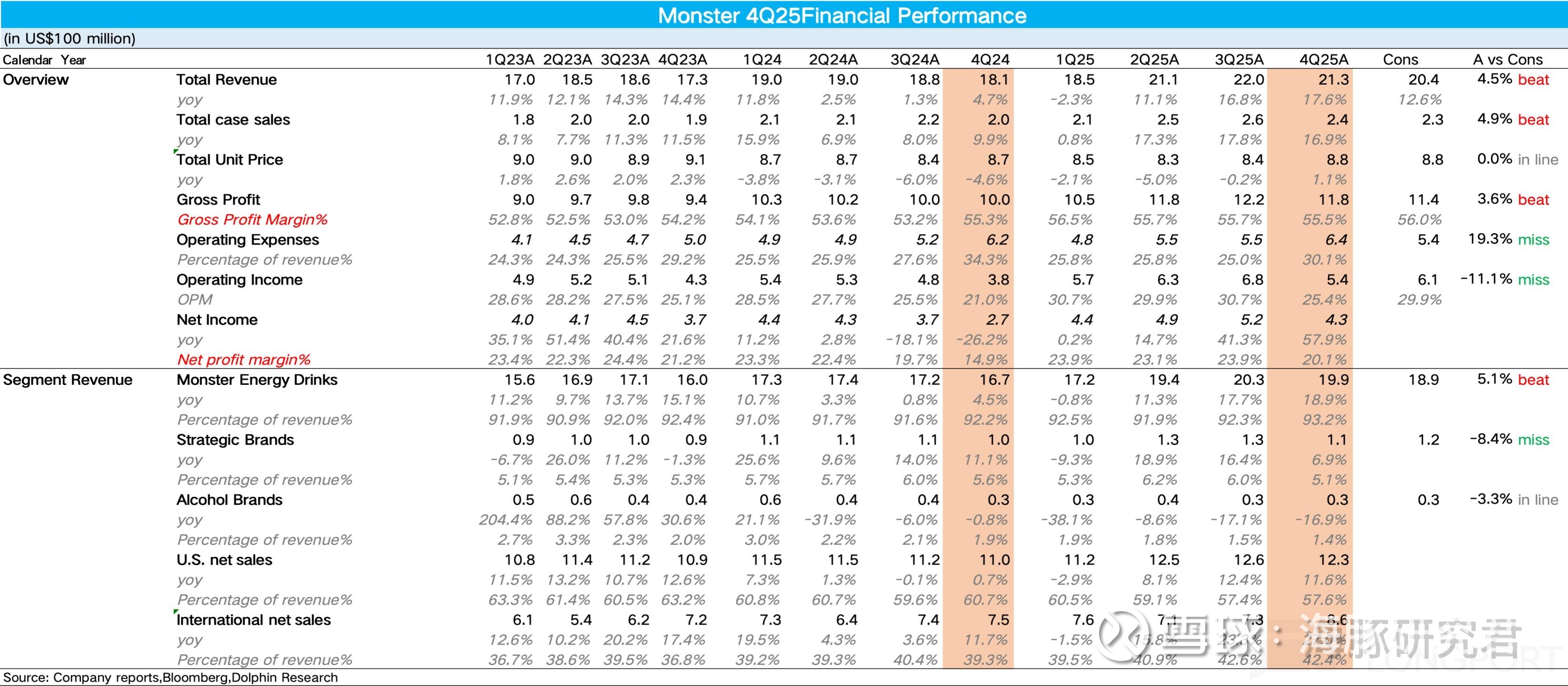 收入增速创单季度新高。先看总数,4Q25Monster 收入端同比增长 17.6%,环比二、三两个季度继续提速,量价拆分看,单位箱销量同比增长 17%,说明公司在改变打发后(加大健康品类的推新和运营力度)效果非常明显,在能量饮料大盘中的份额也在持续修复。价格端,在 11 月提价叠加高溢价产品占比的提升,重新转变为正增长(同比增长 1.1%)。