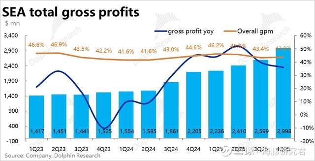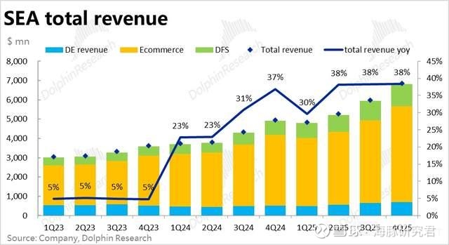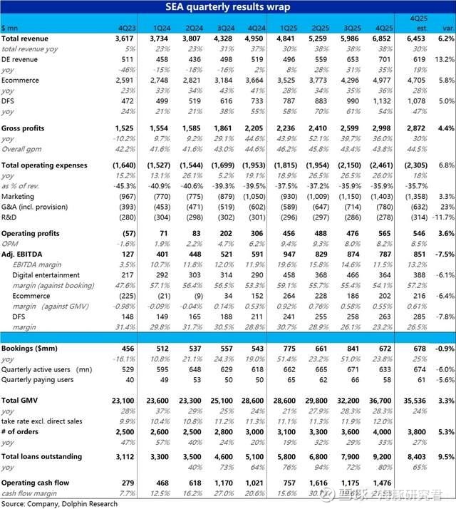 东南亚小腾讯$Sea Limited(SE)$ ,3 月 3 日晚美股盘前交付了 25 年 4 季度业绩,又是熟悉的 “割裂” 表现,一方面核心电商和金融板块增长都相当强劲,远超预期。另一方面,又因投入增加,所有板块利润则全部不及预期。但当前是市场环境,还是相比增长更看重利润,因而又是一次暴跌。具体来看: