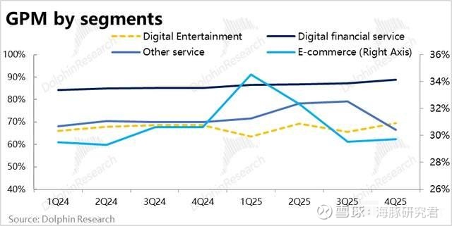 首先在毛利层上,公司整体的毛利率为 43.8%,同比收窄了 0.8pct,明显低于市场预期。分板块来看,游戏和金融板块的毛利率同环比都是在提升的,因此完全是因为电商板块自身毛利率下滑,同时电商板块收入占比又走高的影响。