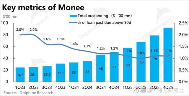 3、Monee 继续高增,坏账可控:核心指引 -- 未偿还贷款总额达$92 亿,同比大增 80%,显著高于卖方预期的$84 亿。