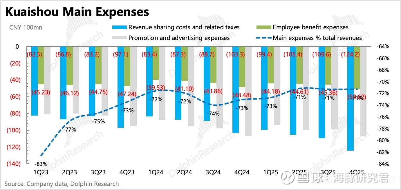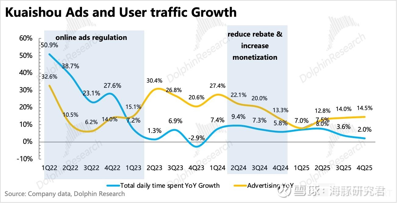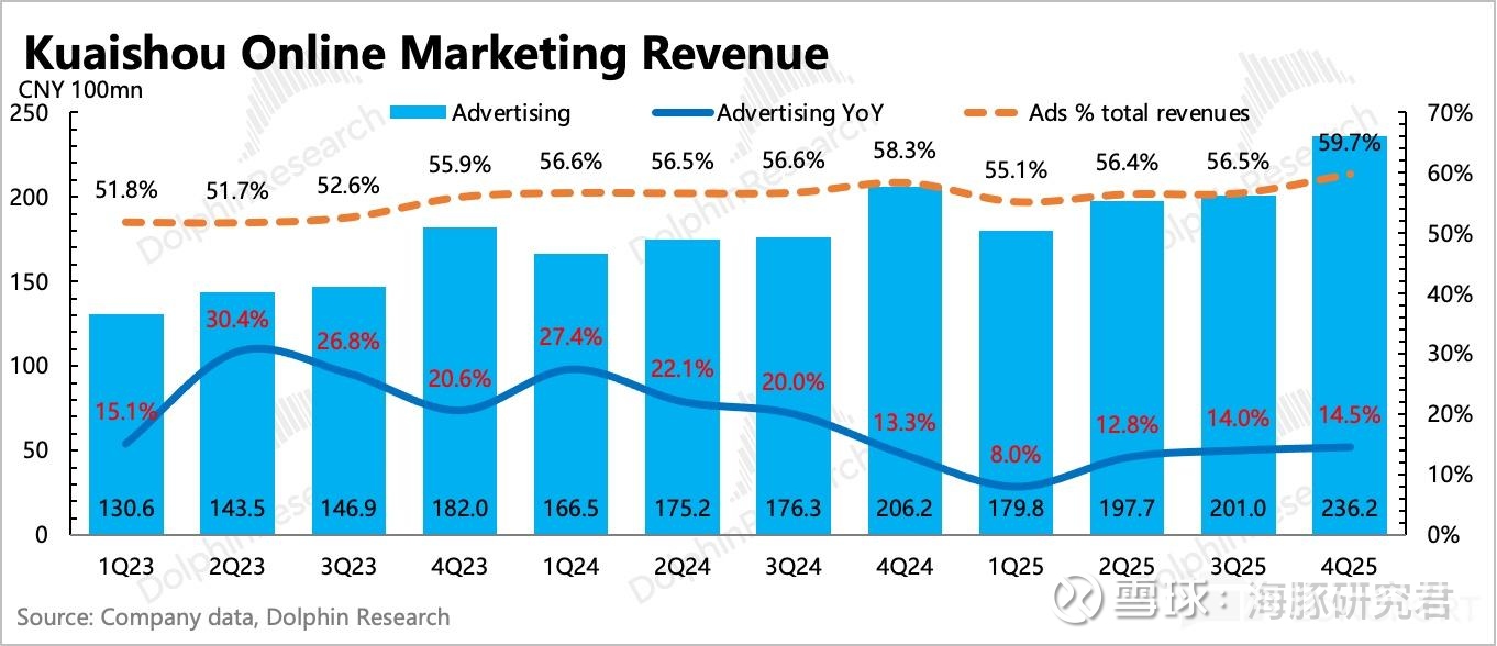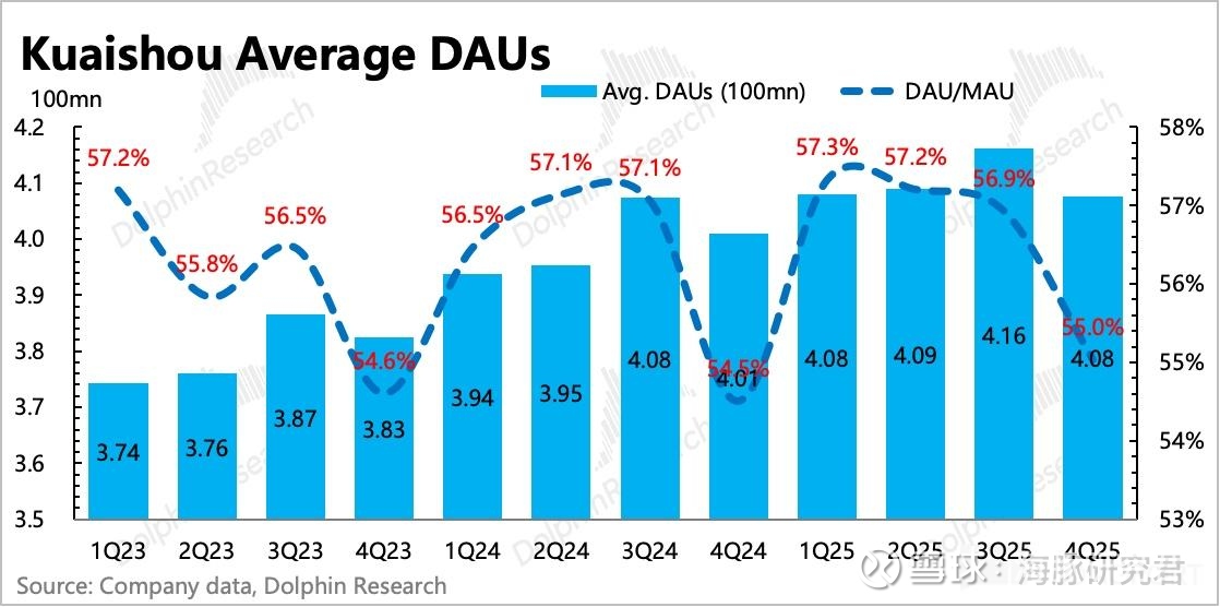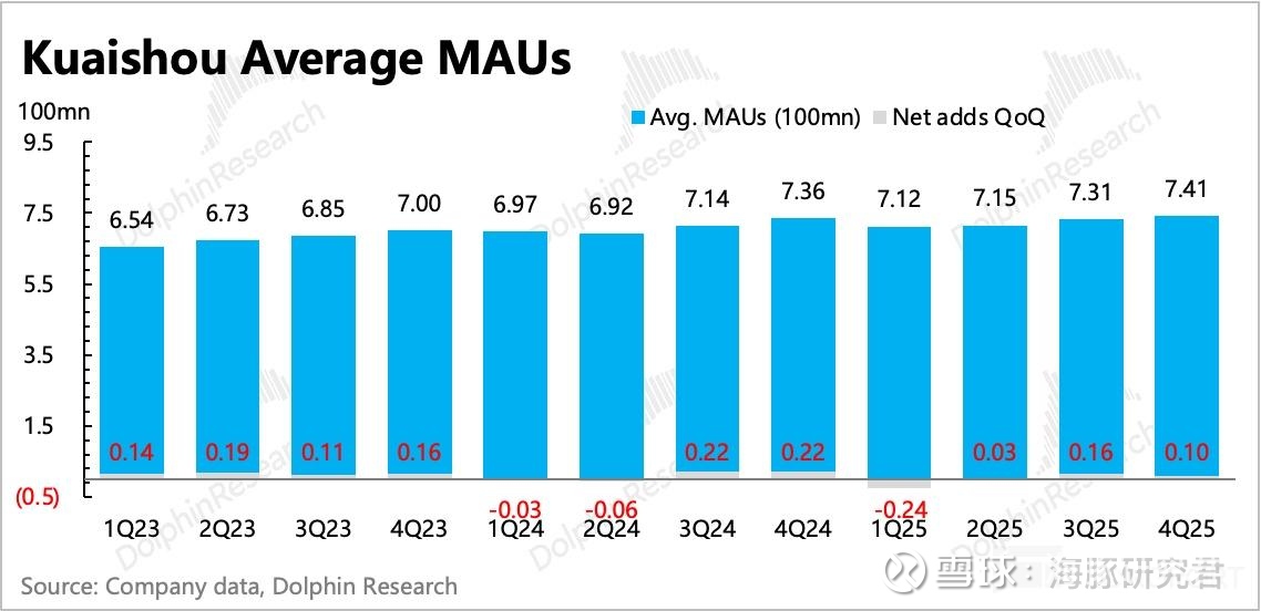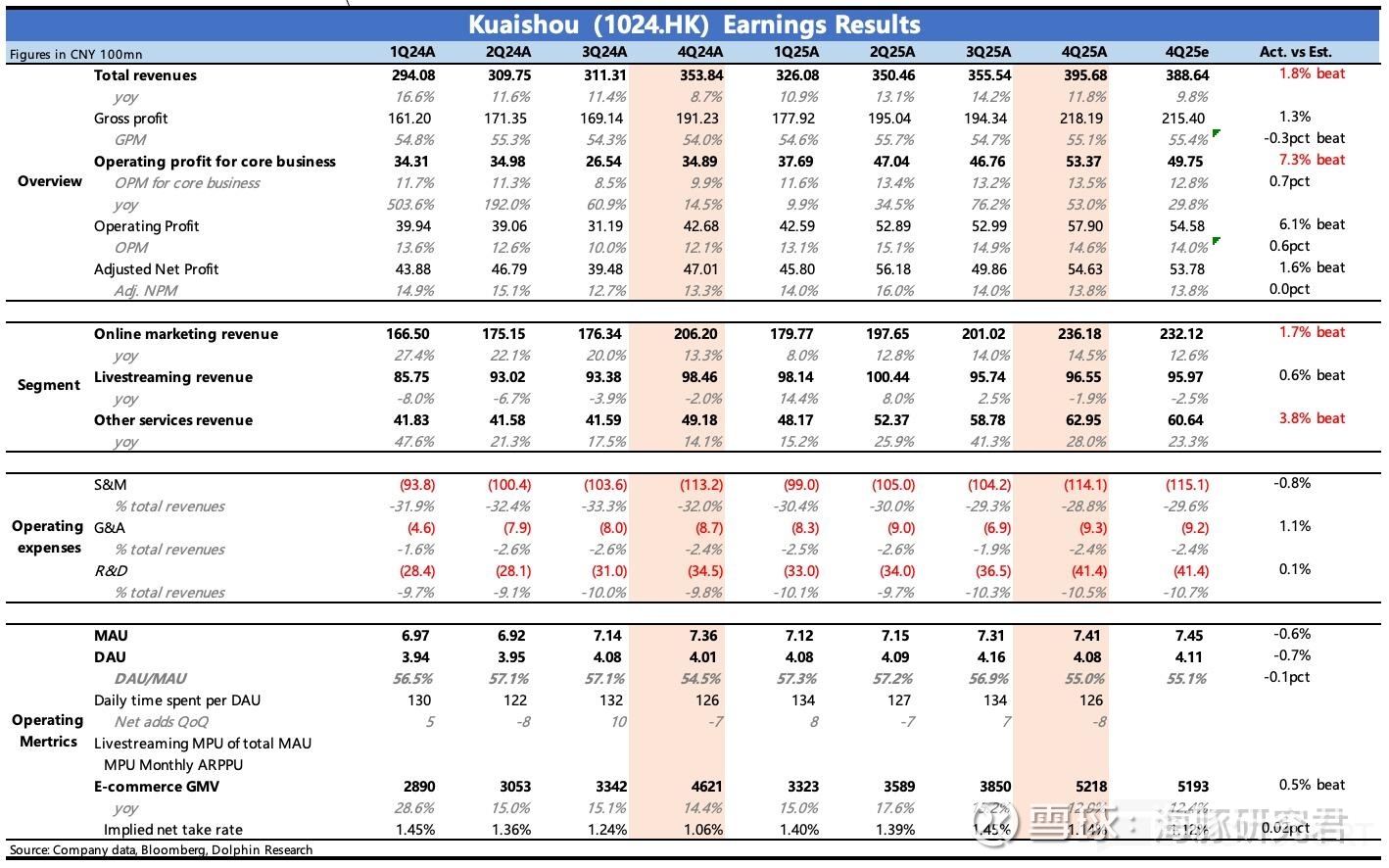 $快手-W(01024)$ 四季报于北京时间 3 月 25 日港股盘后放出。Q4 业绩总体略超预期,亮点还是收入增长稳定下,内部提效对利润的拉动。不过细分业务中,撑估值想象力的可灵不及机构年初的乐观预期,再加上后续的行业竞争,可能导致了 2 月以来的股价调整。