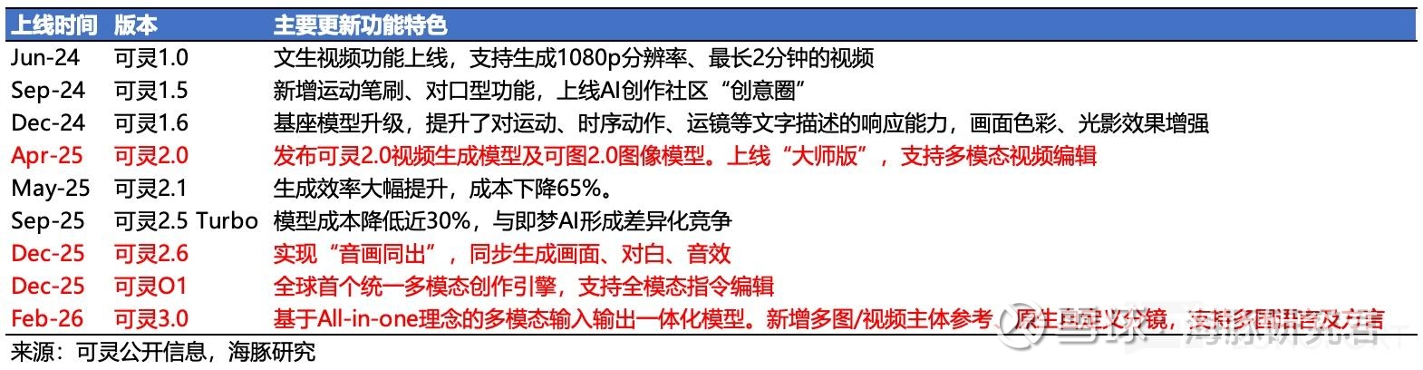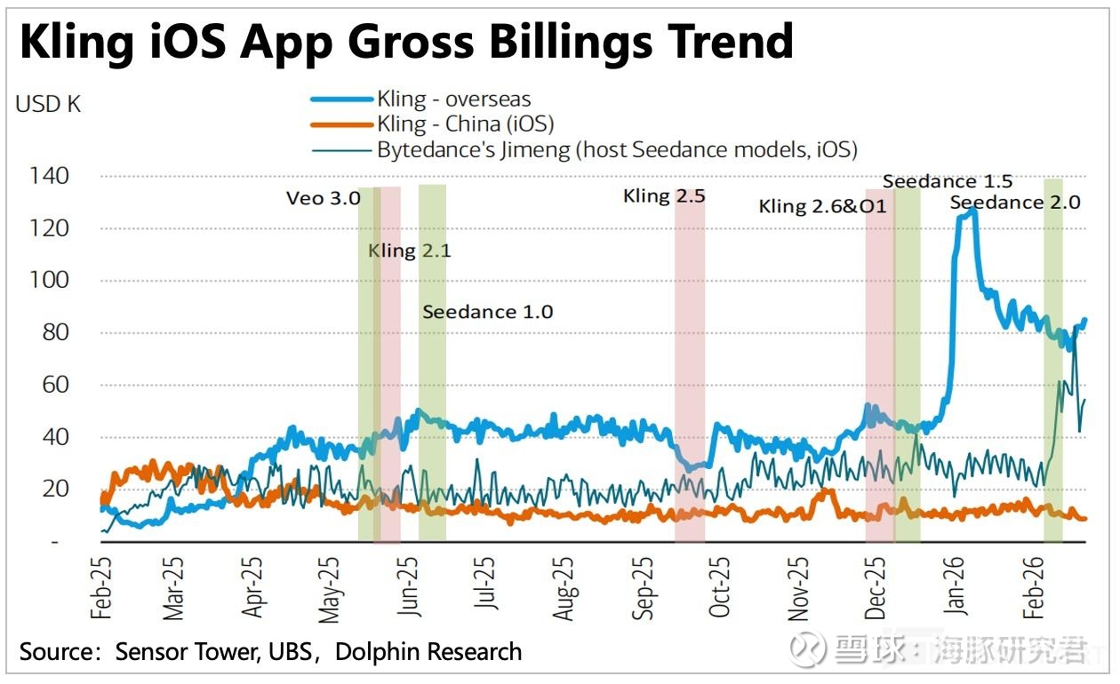2)受益于 12 月 2.6 版本和 2 月 3.0 版本中亮点功能的上线,电话会中公司披露今年可灵 1 月 ARR 已超 3 亿美金,并指引 26 年可灵增速至少翻倍(即 21 亿人民币以上),高于市场的增速预期(+85%yoy)。而市场参考的 iOS 流水变动趋势,则遗漏了占比越来越大但不能很好跟踪的 ToB PC 端表现。