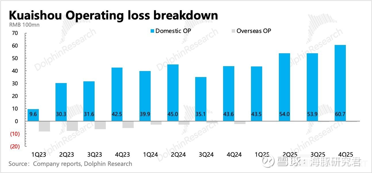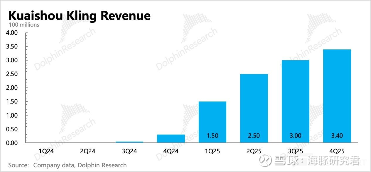不过电话会上公司透露今年 1 月 ARR 的更新(超 3 亿美金,环比去年 12 月增长 25%),表明可灵流水并非如外部数据显示的整体走弱。海豚君认为,这可能是第三方数据仅统计了 iOS App 端的问题,实际上作为本质上属于生产力场景的平台,表现更亮眼的 B 端收入(占比逐季提升,Q3 占比为 40%)应该主要体现在 PC 端,而这恰恰是第三方数据口径缺失的部分。