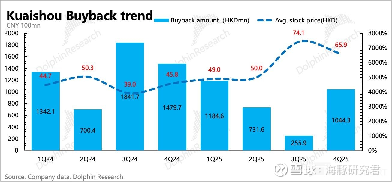 7. 股东回报或有提升可能:四季度股价调整,公司回购力度加大,全年共回购 32 亿 HKD 股票,同时宣布派息 30 亿 HKD,合计来算股东回报 2.7%。目前快手账上现金充裕且近期股价再度承压,因此海豚君猜测可能在静默期后继续维持大力度的回购,具体可看电话会管理层如何表述。