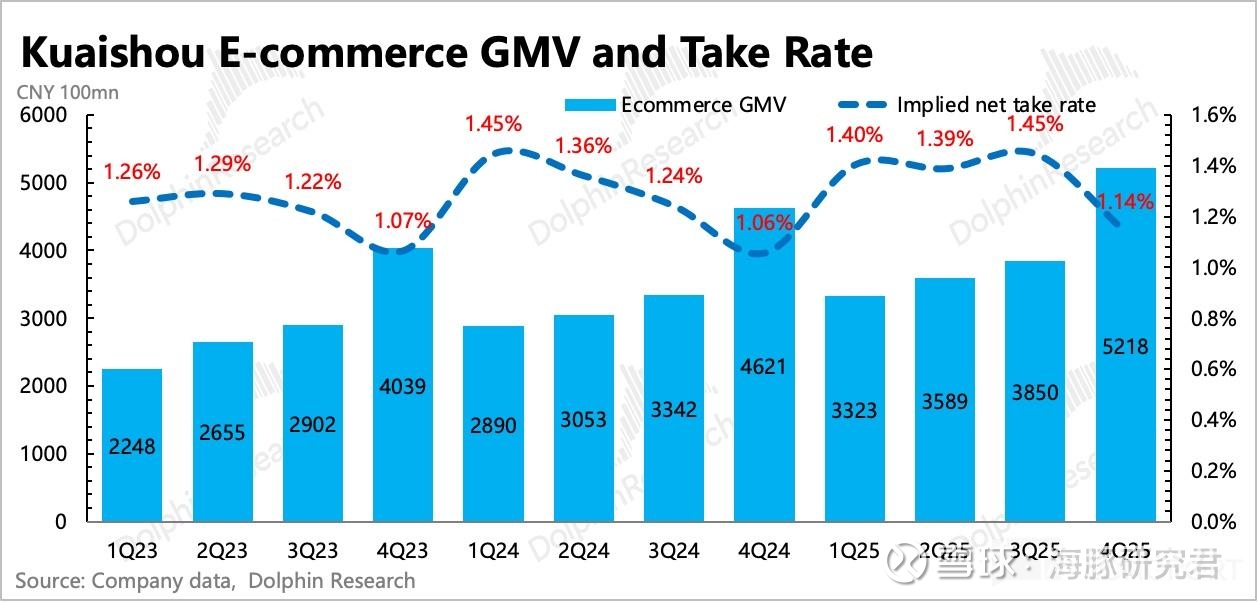 3. 电商增长稳定:Q4 电商 GMV 增速 13%,相比上季度有所放缓,全年近 1.6 万亿交易额。在达人选品分销、全托管以及超级链接服务下,整体电商佣金变现率同比提升 8bps(环比则因旺季佣金返点增加而下滑),使得电商收入同比增速近 22%,小幅超出头部机构预期(18%yoy)。