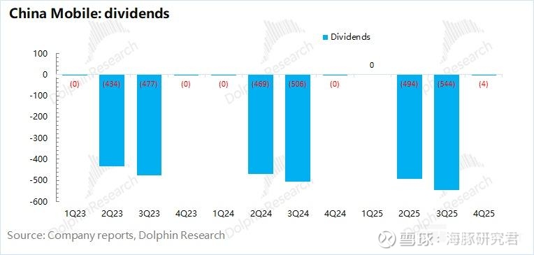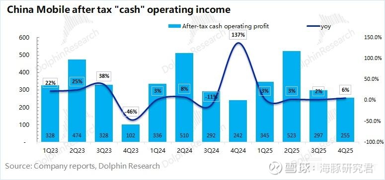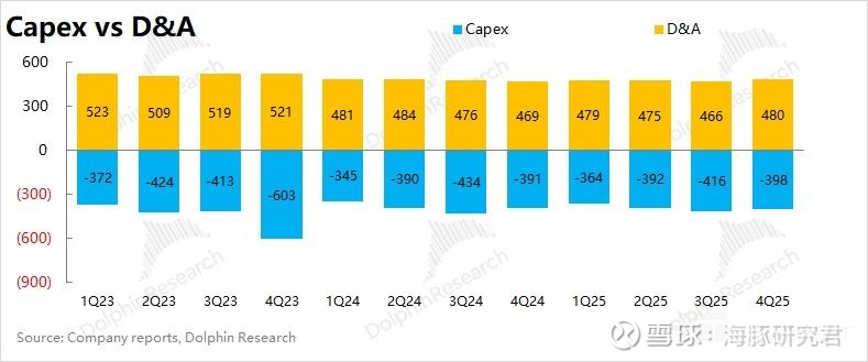 3、资本开支:缩减通讯网络投入,增加算力投入。$中国移动(600941.SH) 2025 年第四季度的资本开支大约为 398 亿元,同比基本持平。