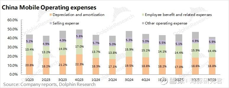 中国移动 2025 年第四季度经营费用 1059 亿元,同比增长下滑 4.9%。海豚君将 “销售费用”、“雇员薪酬费用”、“折旧及摊销” 和 “其他营运支出” 四项都放在经营费用中;