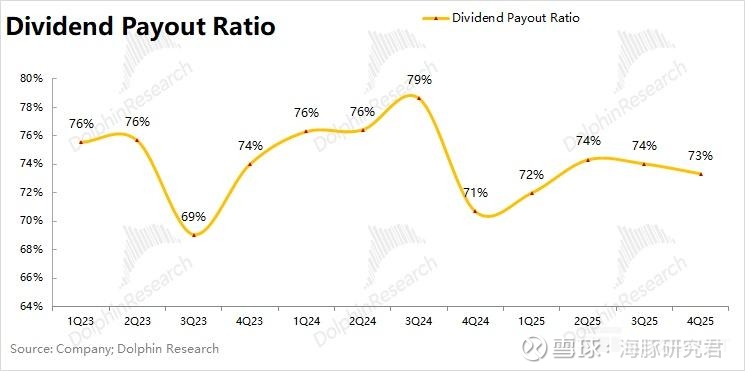 b)分红情况:由于公司通常在二季度/三季度进行分红,2025 年合计分红 1042 亿元左右,估算公司的股息支付率维持在 72% 上方。
