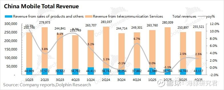 中国移动 2025 年第四季度总营收 2555 亿元,同比增长 2.5%。分项来看,其中公司本季度来自于通讯服务的收入为 2124 亿元,同比微增 0.5%;来自产品销售及其他的收入为 431 亿元,同比增长 14%。