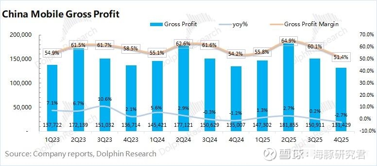 中国移动 2025 年第四季度毛利率 51.4%,同比下滑 3.8 pct。海豚君将 “网络运营及支撑成本” 和 “销售产品成本” 列为营业成本,进而测算公司毛利及毛利率情况。
