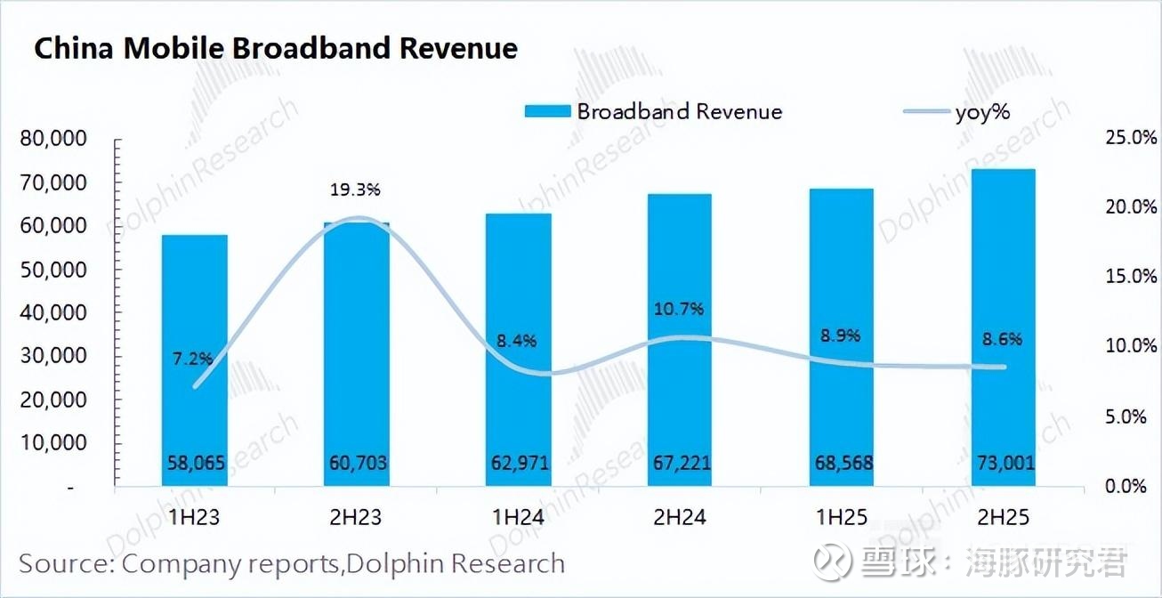 中国移动宽带业务 2025 年下半年收入 730 亿元,同比增长 8.6%。公司的宽带业务继续维持增长的态势,主要得益于公司在宽带市场份额的增加。
