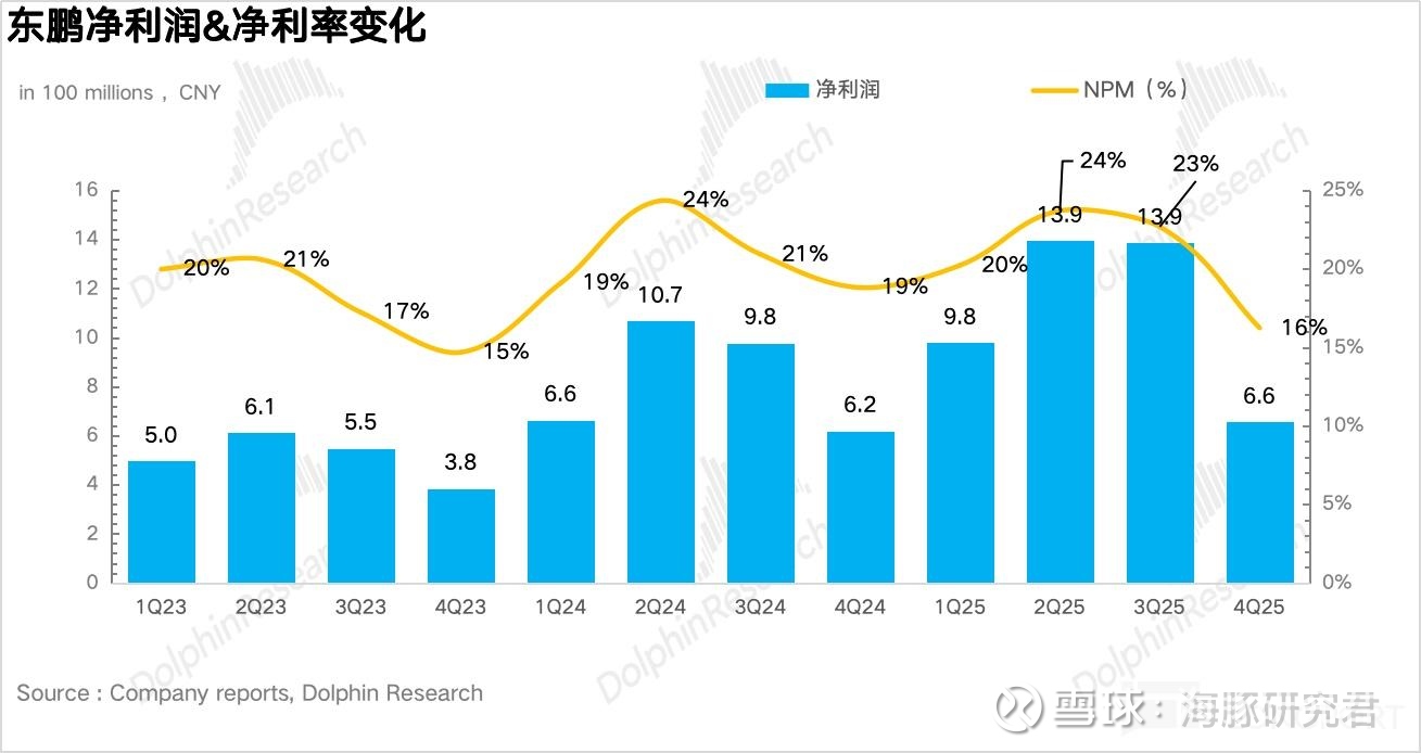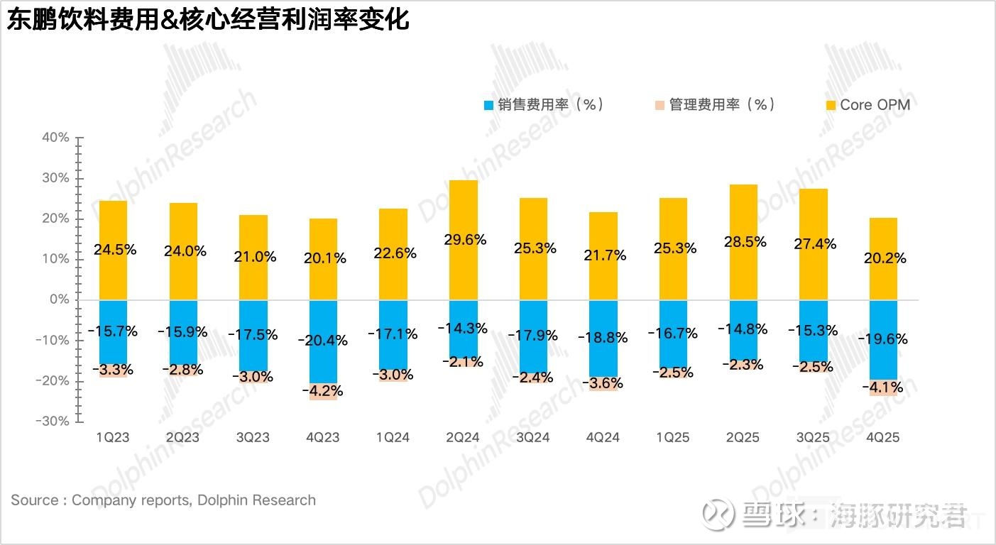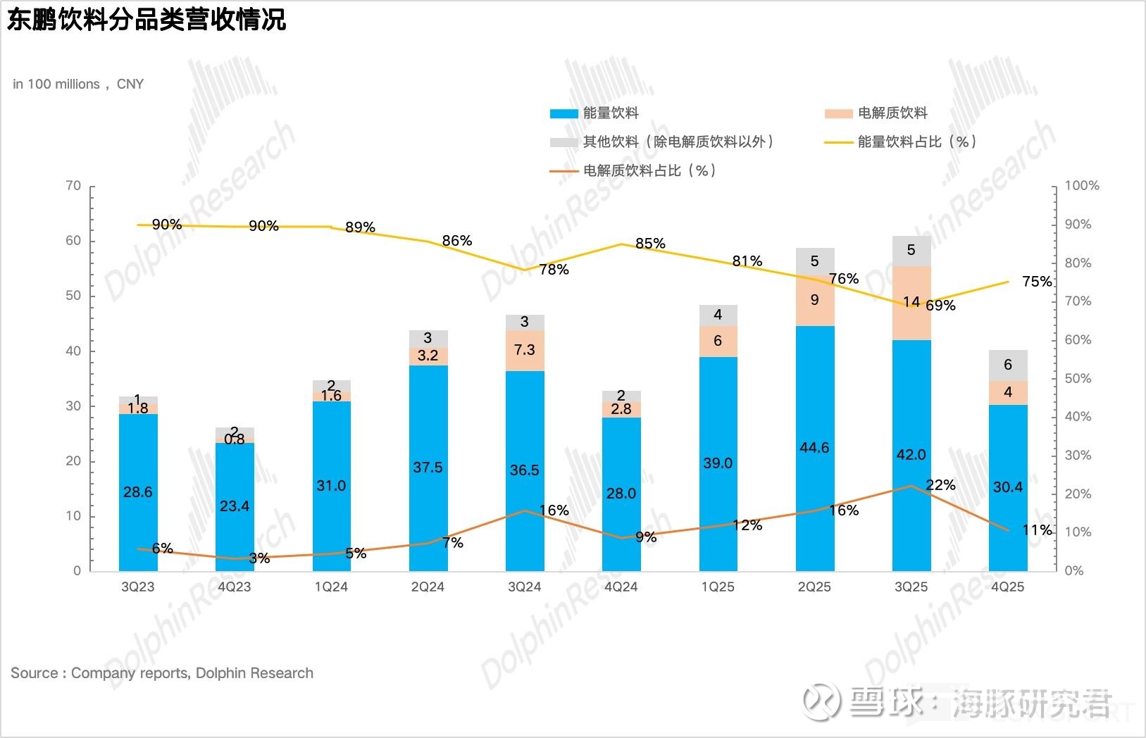 拆分品类看,4Q25 能量饮料实现营收 30.4 亿元,同比增长 8.5%,单季度增速进一步新低,除了自然增长放缓外,海豚君推测也和四季度公司组织架构调整、内部团队处于磨合期,东鹏主动放缓了发货节奏有关。