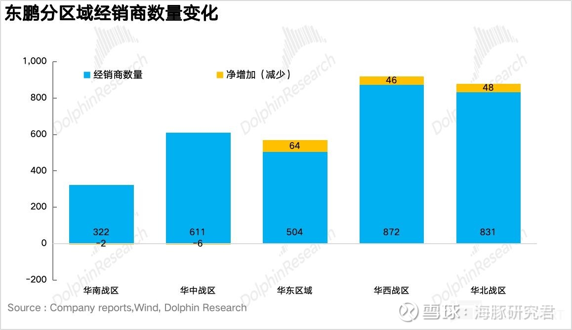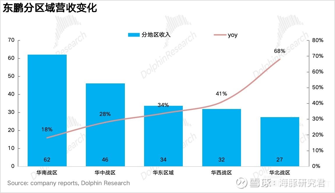 3.、基地市场进入饱和期。分区域来看,由于公司变更了披露口径(大本营广东并入了华南战区),但海豚君结合调研信息推测,两广地区在网点极度成熟的情况下只有低个位数的增长,而华北(京津冀、鲁豫)和华西(川渝、西北)战区由于网点密度远低于南方,仍处于渗透率快速提升阶段。