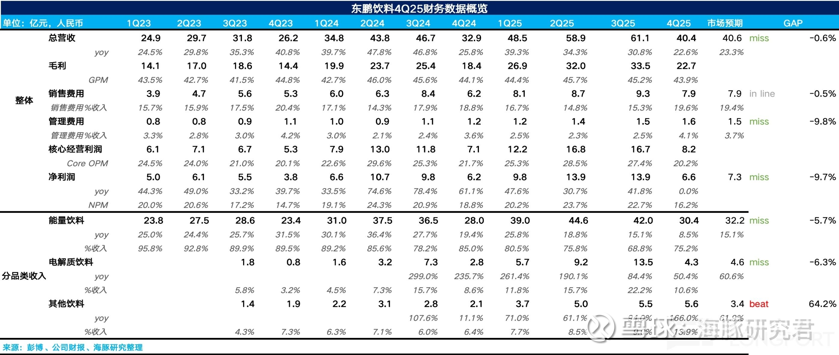 北京时间 3 月 30 日晚间,东鹏饮料(605499.SH)发布了 2025 年四季度业绩。整体上,在基本盘能量饮料持续降速的情况下,公司业绩表现仍然一般,多项核心经营数据均低于市场预期,具体要点如下:$东鹏饮料(SH605499)$ $东鹏饮料(09980)$