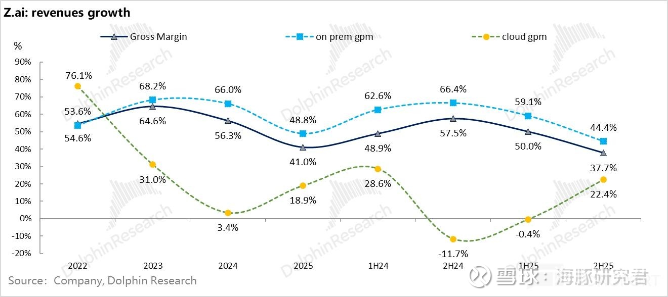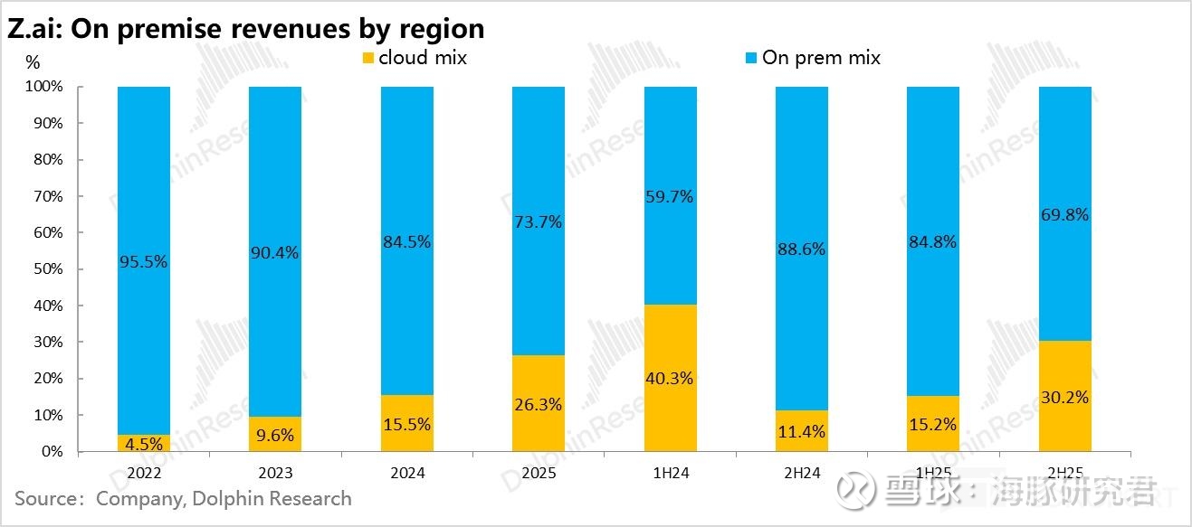 而放缓的主要原因确实应验了资金之前的担忧——收入占比 80%+ 本地部署业务,到了 2025 年下半年增长已经放缓到了 57%,只有 3.7 亿,占比也滑落到了 70%。