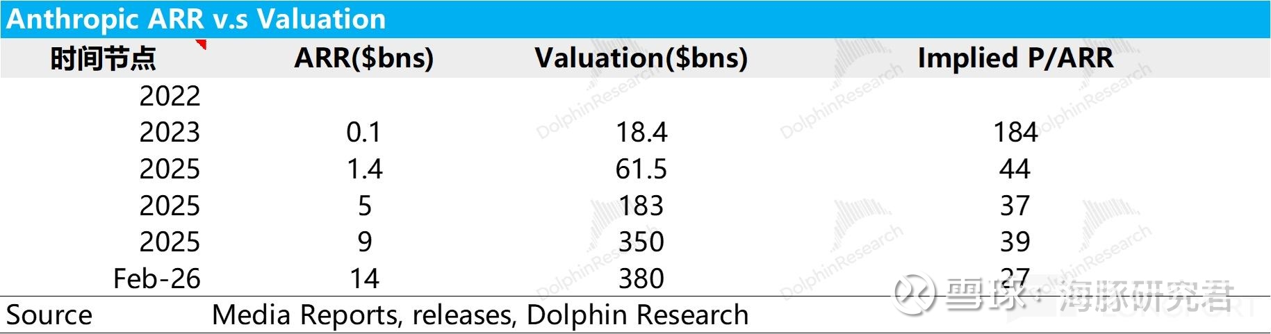 作为参考 Anthropic 年化收入 14 亿美金时候,一级市场融资的估值是 615 亿美金。