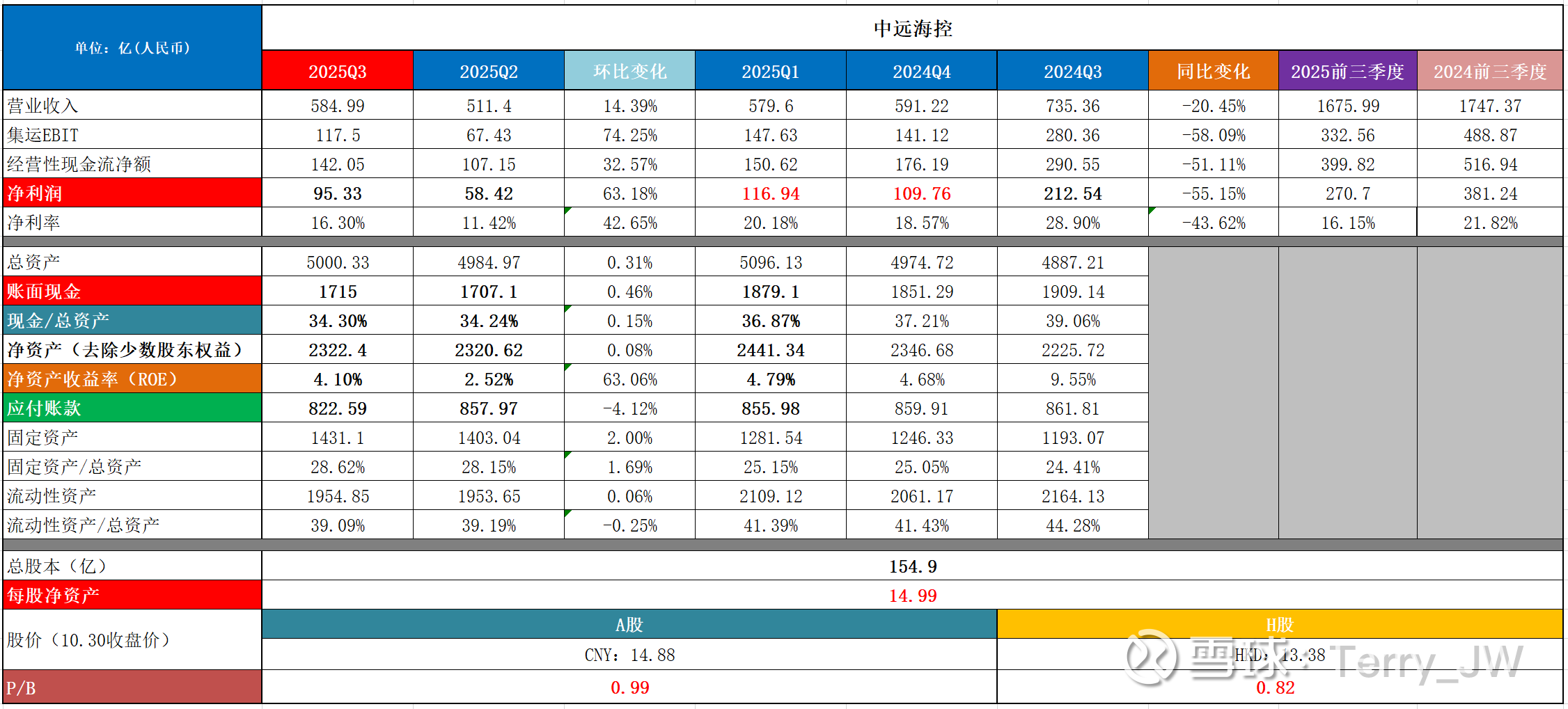 1)三季度营收585亿,利润95.33亿(这个业绩非常不错),较二季度增长63.2%;去年同期212.5,下滑55.2%,单季集运EBIT为117.5亿,具体业务情况下文会详细分析;